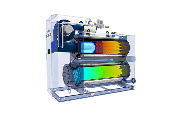 方快容積式熱水鍋爐系列設計為燃燒器下置式煙火管容積式結(jié)構(gòu),燃料經(jīng)燃燒器霧化后在爐膽內(nèi)微正壓燃燒,高溫煙氣在爐膽內(nèi)進行輻射換熱后進入煙火管對流換熱后經(jīng)下煙室排出。通過采用計算機輔助設計,優(yōu)化各個受熱面,爐體結(jié)構(gòu)設計更加合理。 鍋爐無需冷凝器,爐體內(nèi)部即可實現(xiàn)冷凝,排煙溫度可低至50℃以下,熱效率可達106.6%以上。