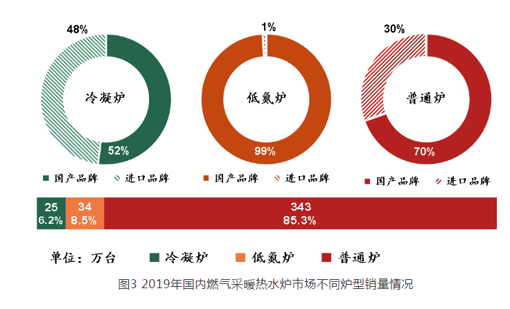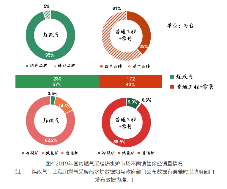 2019 年用于“煤改氣”工程的燃?xì)獠膳療崴疇t銷量為 230 萬(wàn)臺(tái),占全年總銷量的 57% ,相比 2018 年(“煤改氣”工程用銷量 145 萬(wàn)臺(tái))增幅 58.6% 。其中,冷凝爐銷量為 8 萬(wàn)臺(tái),占“煤改氣”工程總銷量的 3.5% ;低氮爐銷量為 33 萬(wàn)臺(tái),占“煤改氣”工程總銷量的 14.3% ;普通爐銷量為 189 萬(wàn)臺(tái),占“煤改氣”工程總銷量的 82.2% 。國(guó)產(chǎn)品牌銷量為 219 萬(wàn)臺(tái),占“煤改氣”工程總銷量的 95% ;進(jìn)口品牌銷量為 11 萬(wàn)臺(tái),占“煤改氣”工程總銷量的 5% 。