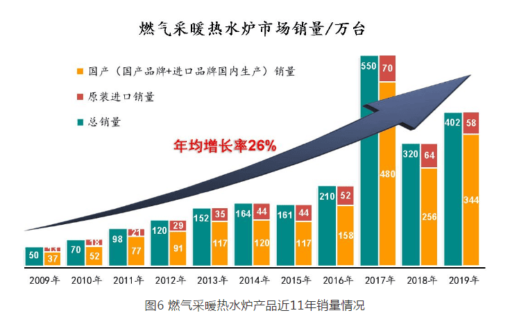 根據(jù)統(tǒng)計(jì)數(shù)據(jù),自 2009 年以來(lái)燃?xì)獠膳療崴疇t產(chǎn)品銷量急劇上升,中國(guó)國(guó)內(nèi)市場(chǎng) 2009 年銷量為 50 萬(wàn)臺(tái)(原裝進(jìn)口 13 萬(wàn)臺(tái)),截至 2019 年底,國(guó)內(nèi)市場(chǎng)銷量達(dá)到了 402 萬(wàn)臺(tái)(原裝進(jìn)口 58 萬(wàn)臺(tái)),年均增長(zhǎng)率達(dá) 26% ,遠(yuǎn)遠(yuǎn)超出中國(guó)經(jīng)濟(jì)發(fā)展的平均速度。