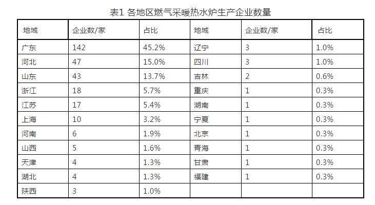 截止 2019 年 8 月底,有 314 家企業(yè)獲得了燃?xì)獠膳療崴疇t生產(chǎn)許可證。國(guó)內(nèi)各地區(qū)燃?xì)獠膳療崴疇t生產(chǎn)企業(yè)數(shù)量和分布情況見(jiàn)表 1 和圖 1 。