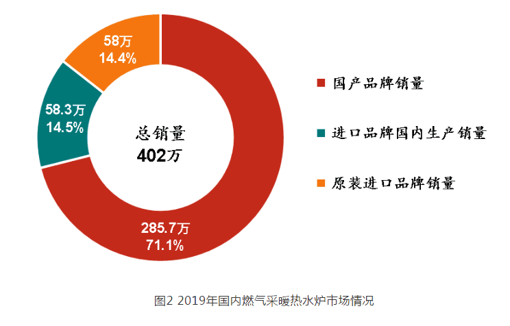 據(jù)統(tǒng)計(jì), 2019 年中國(guó)市場(chǎng)燃?xì)獠膳療崴疇t總銷量為 402 萬(wàn)臺(tái),相比 2018 年( 320 萬(wàn)臺(tái))增加了 82 萬(wàn)臺(tái),增幅 25.6% 。其中,國(guó)產(chǎn)品牌國(guó)內(nèi)銷量為 285.7 萬(wàn)臺(tái),占全年總銷量的 71.1% ,相比 2018 年( 214 萬(wàn)臺(tái))增幅 33.5% ;進(jìn)口品牌在國(guó)內(nèi)生產(chǎn)的銷量為 58.3 萬(wàn)臺(tái),占全年總銷量的 14.5% ,相比 2018 年( 42 萬(wàn)臺(tái))增幅 38.8% ;原裝進(jìn)口品牌的銷量為 58 萬(wàn)臺(tái),占全年總銷量的 14.4% ,相比 2018 年( 64 萬(wàn)臺(tái))降幅 9.4% 。