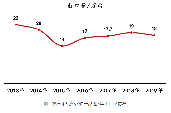 2019 年燃?xì)獠膳療崴疇t全年出口總量為 18 萬(wàn)臺(tái),相比 2018 年( 19 萬(wàn)臺(tái))減少 1 萬(wàn)臺(tái),降幅 5.3% 。圖 5 為燃?xì)獠膳療崴疇t產(chǎn)品近 7 年出口量分布情況。